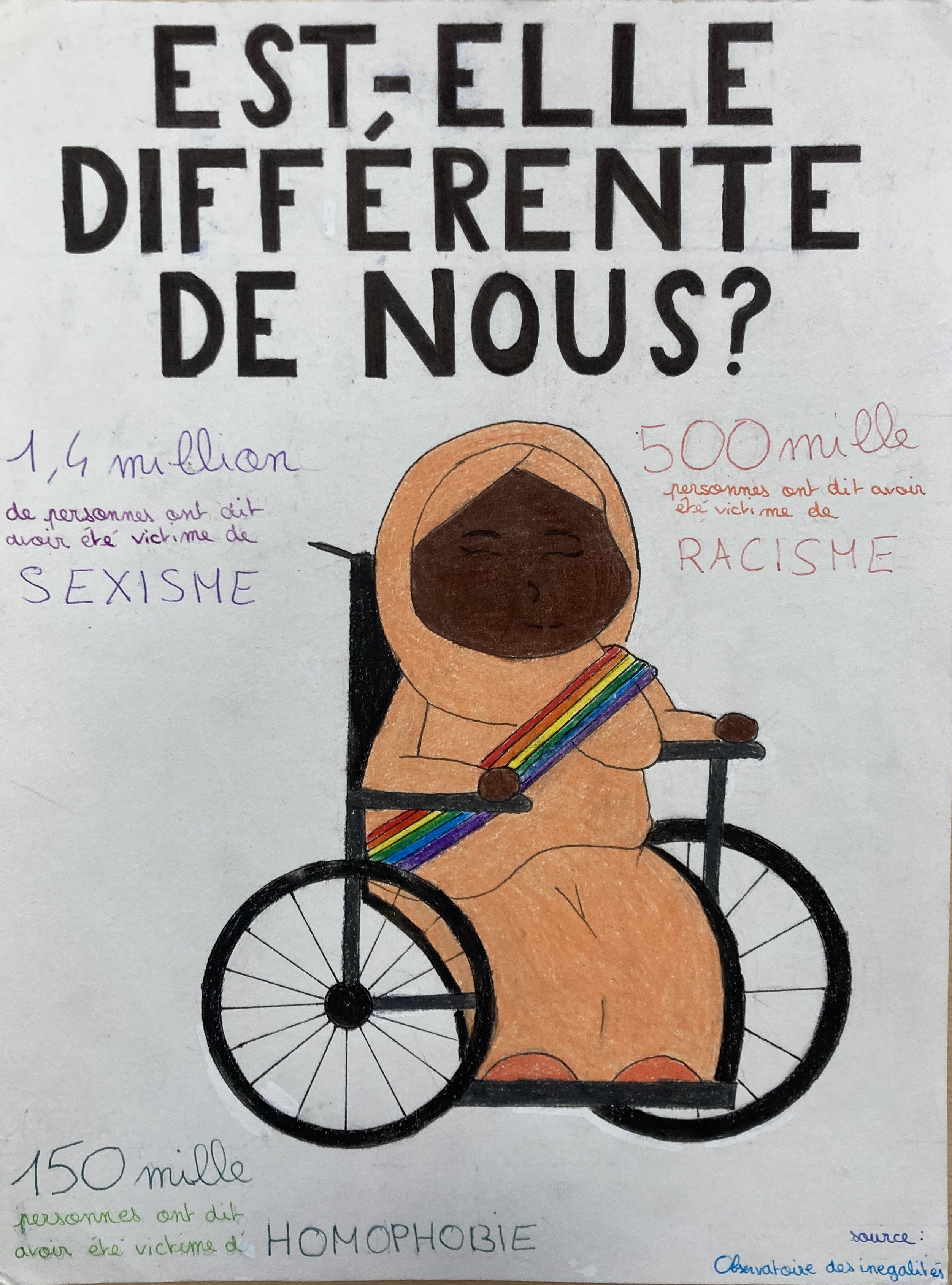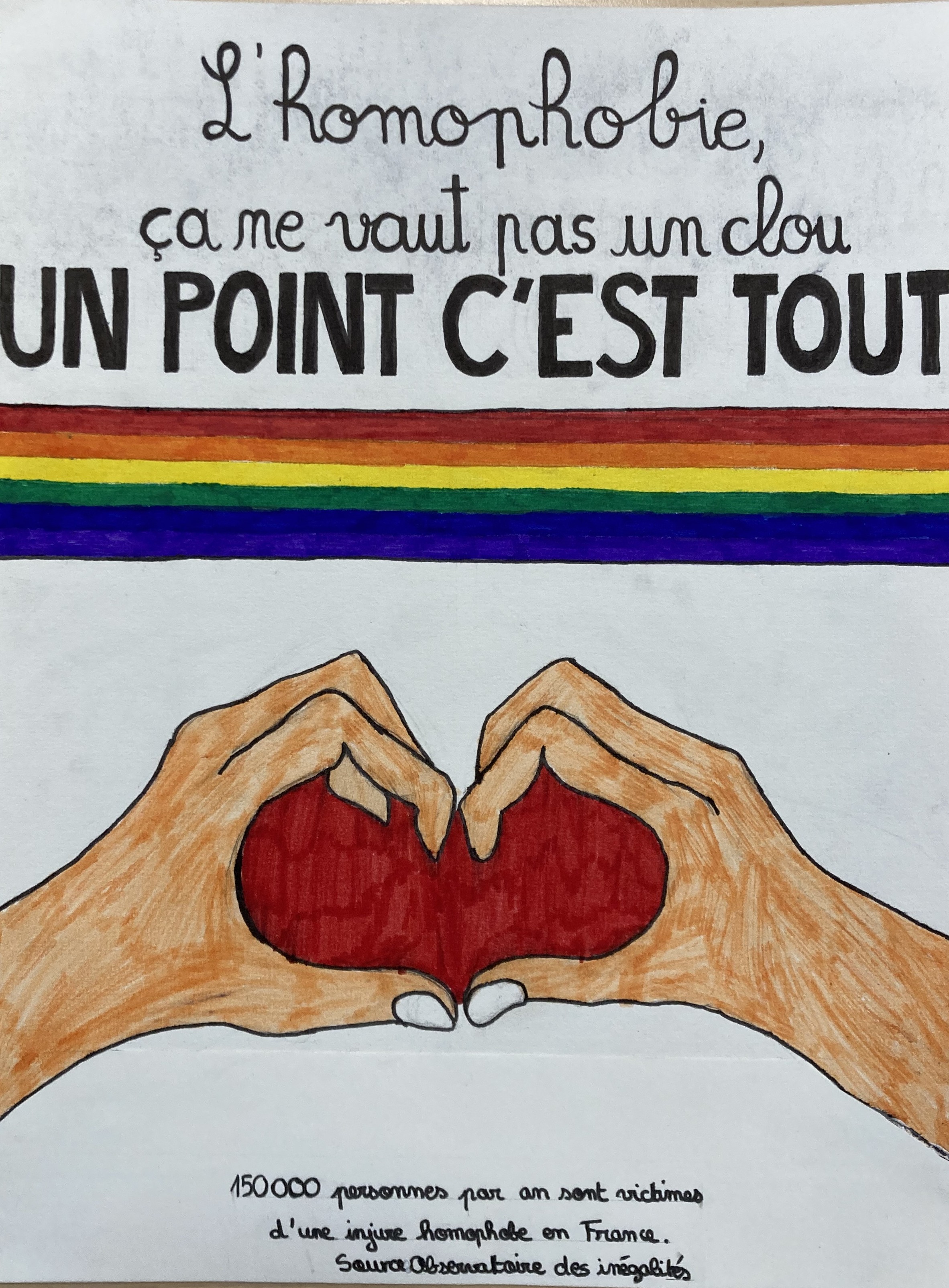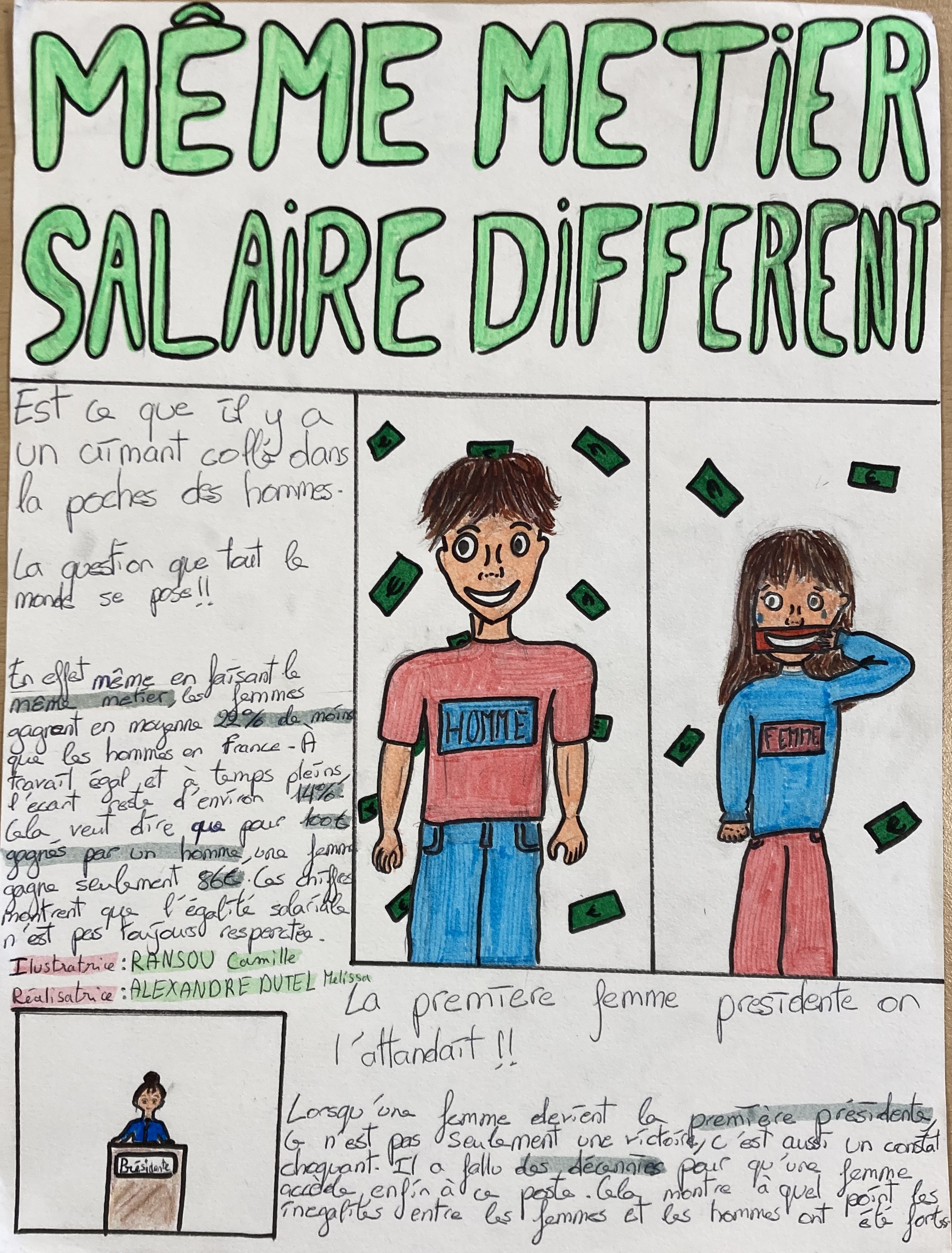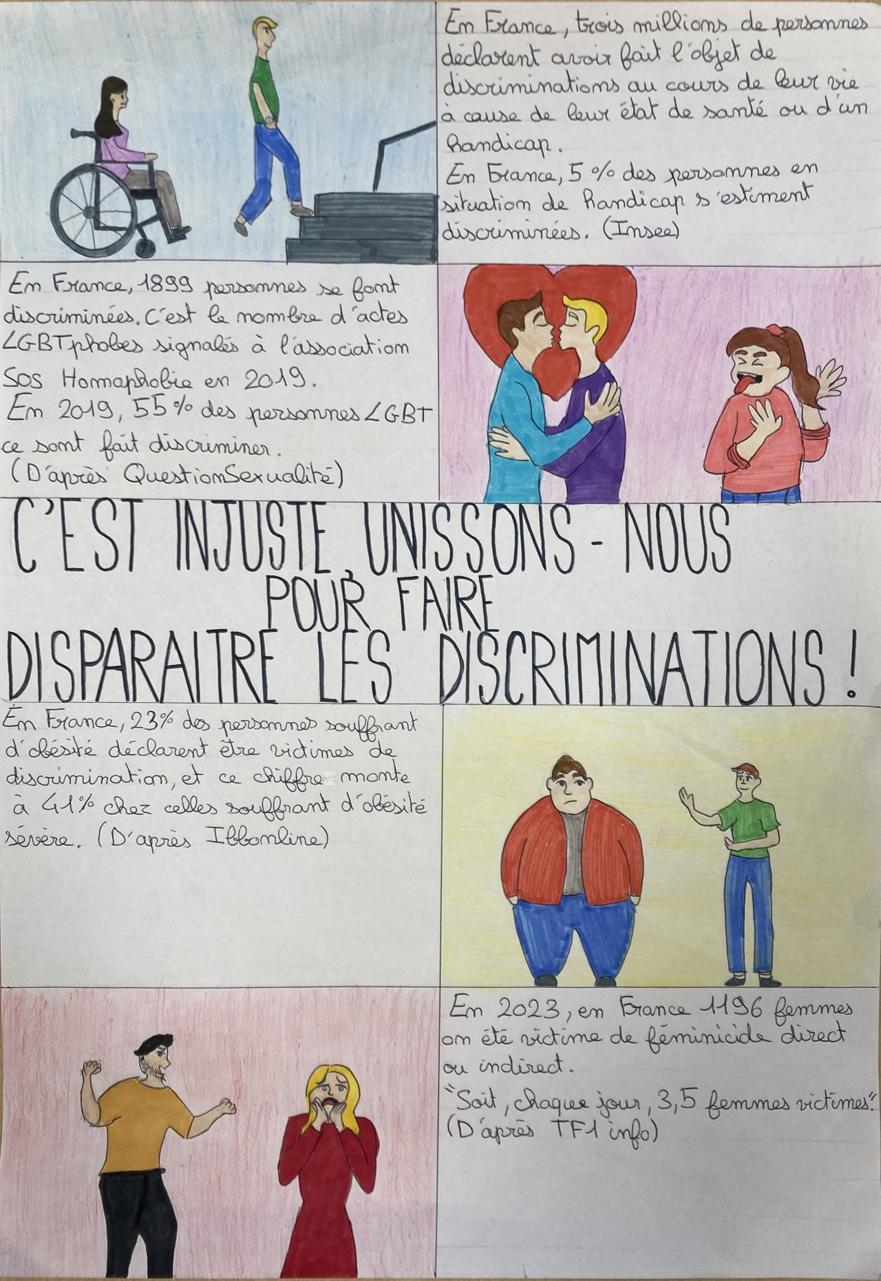 Cette année, ce sont les élèves des classes de 5ème C, G et F, qui, en binômes ou trinômes et sous l'impulsion de madame Guyon, leur professeur d'éducation civique, ont réalisé affiches ou vidéos sur le thème proposé, après avoir travaillé, en classe, la question de l'égalité et le refus des discriminations.